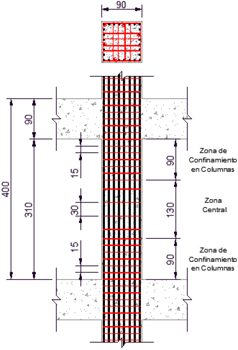 Los elementos del marco se diseñaron conforme a lo establecido en las secciones 6.1 y 6.2 (NTCC-04 2004), correspondientes al diseño de vigas y columnas de concreto reforzado no dúctiles, y se complementaron los requisitos antes mencionados con recomendaciones mínimas para detallado por confinamiento dúctil. En la sección 7.2.3, se especifica la separación mínima por confinamiento para elementos a flexión (vigas), mientras que en la sección 7.3.4 se establece la separación mínima de estribos por confinamiento de elementos sometidos a flexocompresión (columnas, Figura 2), de las Normas Técnicas Complementarias para Diseño y Construcción de Estructuras de Concreto del 2004 (NTCC-04 2004). El fundamento de adicionar estos requisitos mínimos para detallado por confinamiento dúctil a los elementos de concreto, diseñados como elementos no dúctiles, tiene su base en la dificultad que exponen los ingenieros estructurales en México para construir y diseñar marcos dúctiles siguiendo todas las pautas expuestas en las normas (Riobóo 1995, Tena-Colunga et al. 2008).