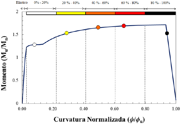 La mejor manera de comparar el parámetro de confinamiento, acorde con los niveles de detallado dúctil que se proporcionaron a los elementos de concreto reforzado, es por medio del mapeo de fluencias inelásticas entre los marcos sin detallado dúctil y los correspondientes con detallado por confinamiento dúctil. En la Figura 25 se presenta de manera ilustrativa la escala de colores asignada para los elementos de concreto. El punto en color blanco, representa el punto a partir del cual el elemento empieza a incursionar en el intervalo inelástico; el punto en color negro, representa la curvatura última que el elemento de concreto reforzado es capaz de soportar, los puntos amarillo, naranja y rojo, son puntos intermedios entre el punto de fluencia y el punto último que soporta la sección.