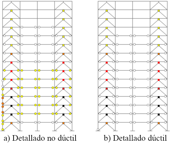 El objetivo principal de adicionar requisitos mínimos de confinamiento dúctil a los marcos de concreto con disipadores de energía por histéresis del material, es analizar si ésto es suficiente para disminuir las magnitudes de rotación, representadas por una escala de colores (Figura 6), que está asociado al daño moderado en vigas y columnas para marcos de concreto reforzado con detallado no dúctil y disipadores de energía (Nangullasmú 2011, Tena y Nangullasmú 2013, Tena-Colunga y Nangullasmú-Hernández 2015). Usando los lineamientos de detallado no dúctil, se presentaban fluencias incipientes a moderadas en algunas columnas del perímetro de ciertos niveles, aún para los balances óptimos de rigidez entre los sistemas estructurales (Figura 7). Es importante recalcar que para que este sistema estructural sea eficiente y aporte un beneficio adicional sobre un sistema estructural convencional, el daño se debe focalizar en los disipadores de energía, y que los elementos del marco deben permanecer prácticamente elásticos o con una no linealidad incipiente durante todo el evento sísmico.