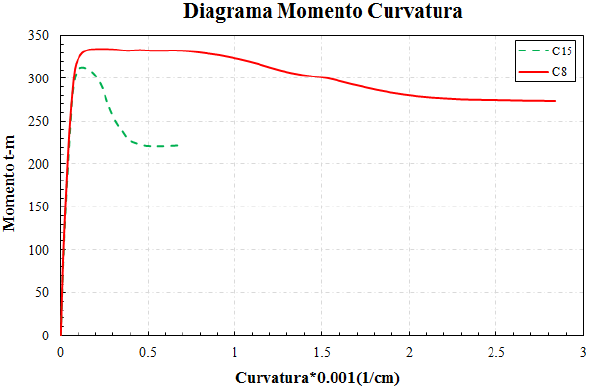 Con base en el soporte teórico que produce el efecto de confinamiento descrito con el modelo de Kent y Park, y modelando las secciones transversales con su respectivo refuerzo longitudinal y transversal, resultado del diseño descrito en la sección anterior, se comparan en la Figura 4 los diagramas momento-curvatura para una columna de concreto con distintas separaciones de estribos. La línea discontinua representa un detallado no dúctil con una separación de estribos de 15 cm y la línea continua representa un detallado transversal dúctil según los requerimientos de las NTCC-04 (2004). De esta figura se observa que proveer a los elementos de concreto reforzado con las especificaciones mínimas de detallado dúctil, aumenta ligeramente su resistencia con respecto a la de un detallado no dúctil, pero incrementa notablemente su curvatura límite, siendo éste el parámetro más característico. En consecuencia, su capacidad de rotación incrementa de tres a cuatro veces con respecto a la de un detallado transversal no dúctil, y se verá reflejada con mayor detalle en la comparación de mapeos de fluencia que se exponen y discuten más adelante.