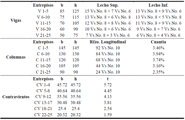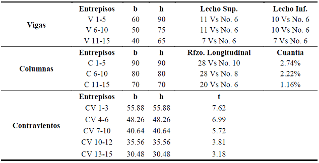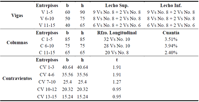 Además de vigilar que los balances de rigidez lateral entre los sistemas cumplieran con los parámetros propuestos inicialmente en la metodología de prediseño, se revisaron que los elementos estructurales cumplieran con los requisitos de resistencia que las Normas Técnicas Complementarias del Distrito Federal del 2004 exponen en cada uno de sus apartados para cada material involucrado (acero para contravientos y concreto para elementos del marco). Con base en esto, los contravientos se revisaron para que su relación de esbeltez no excediera el máximo permitido por la norma (NTCEM-04, Ap. 6.2.3.2), y que su resistencia de diseño estuviera dentro de los estados límites pertinentes (NTCEM-04, Ap. 3.2.2). Como la filosofía de diseño de este sistema estructural es que se desarrolle toda la no linealidad del sistema en los disipadores de energía, se prevé que los contravientos permanezcan elásticos durante todo el evento sísmico, con la finalidad de evitar que los contravientos se dañen y los disipadores se desprendan antes que alcancen su ductilidad objetivo. Para asegurar esta premisa, se utilizó un factor de seguridad de 1.5 en la revisión por resistencia para los contravientos, según recomendaciones del Ing. Enrique Martínez Romero (Martínez 1994).