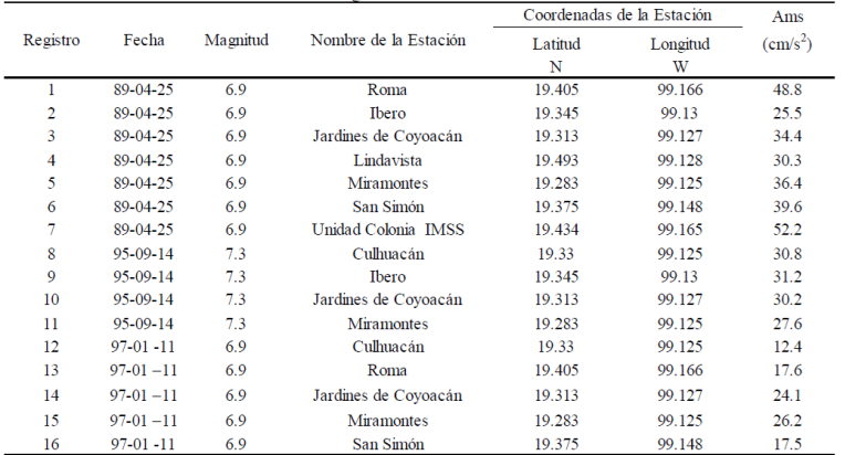 Para la evaluación de la ductilidad equivalente y la determinación de espectros de respuesta, se utilizó un total de 68 movimientos sísmicos registrados en las zonas IIIa, IIIb, IIIc y IIId de la Ciudad de México durante eventos sísmicos de subducción. Las tablas A1, A2, A3 y A4 incluidas en el Apéndice A de este artículo clasifican los registros sísmicos conforme a lo establecido por el cuerpo principal de las NTCDS; además, resumen algunas de sus características más relevantes. Los grupos de registros sísmicos se tomaron de un estudio realizado por Villa-Velázquez y Ruiz (2001), y se escalaron para ser congruentes con el nivel de aceleraciones que establecen las NTCDS para cada zona.