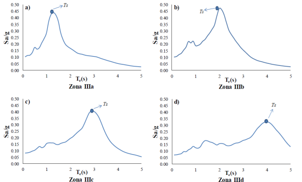 La figura 2 muestra los espectros elásticos promedio para las distintas zonas sísmicas investigadas, las ordenadas espectrales corresponden a la pseudo-aceleración, S a , expresada como fracción de la aceleración de la gravedad, g. Mientras, el eje horizontal se refiere al periodo estructural, T e . Los periodos del suelo obtenidos pretenden ser aproximados para cada zona. Dado que el periodo del suelo se encuentra relacionado con el daño estructural, servirá de referencia para análisis de resultados en esta investigación.