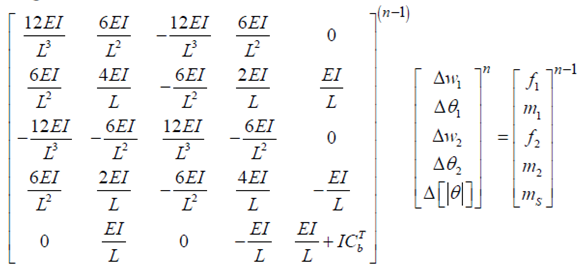 Los términos de la matriz del elemento finito barra de la ec. (10) se agrupan respectivamente con los elementos viga delgada de la ec. (23) y con los de la viga gruesa de la ec. (35), tal que se tienen los elementos viga-columna con discontinuidad interior delgada y gruesa, respectivamente: