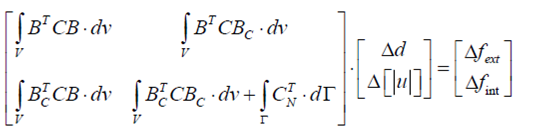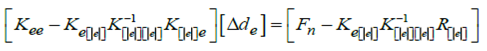 donde K ee , K e[|e|] , K [|e|]e, y K [|e|][|e|] son las submatrices asociadas a los GDL, incluyendo la discontinuidad del elemento. F n y R [|e|] son los vectores de fuerzas y momentos nodales, respectivamente. Δd e son los desplazamientos en los nodos y Δ[|e|] los saltos en la discontinuidad.