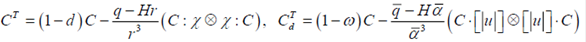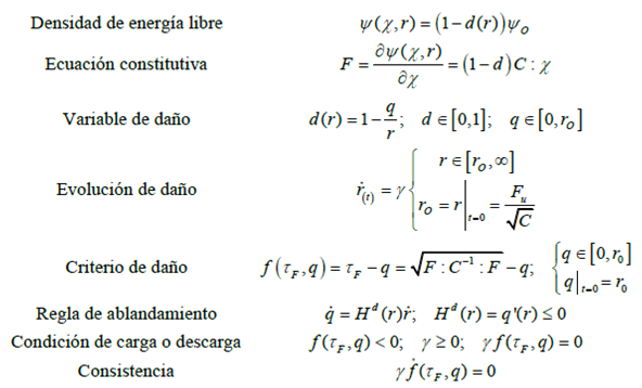 donde Ψ es la densidad de energía libre, representada por el área bajo la curva del modelo constitutivo, X representa el vector de desplazamientos, C son las constantes elásticas, F el vector de fuerzas, d es la variable de daño que depende de la variable de ablandamiento q, H es el parámetro de ablandamiento, γ es el multiplicador de daño que determina la condición de carga o descarga y r es la variable de estado. La función ƒ( ƮF, q) limita la superficie de falla del material, en el espacio de fuerzas.