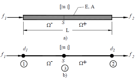 Sea una barra con longitud L, sección transversal A y módulo elástico E, como se muestra en la Figura 1a, la cual se somete a carga axial, ƒ, hasta que ocurre una concentración de deformaciones en la zona S, donde se presenta una discontinuidad o salto en el desplazamiento axial, [|u|], por lo que el dominio de la barra ΩÌ [0,L], queda dividido por la discontinuidad S, tal que Ω= Ω-+ Ω+.