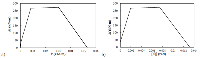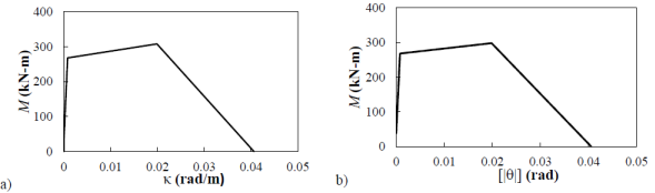 Los modelos constitutivos continuo M- K y discreto M-[|θ|] se muestran respectivamente en la Figura 24a y b. Los modelos constitutivos continuo V-ℽ y discreto V-[|w|] se muestran respectivamente en la Figura 25a y b. Este ejemplo se analizó utilizando las formulaciones de vigas-columnas gruesas y delgadas con discontinuidades interiores desarrolladas respectivamente en las secciones 0 y 0. En el análisis de este ejemplo se impuso gradualmente ν, en el extremo libre, calculando las reacciones de fuerza, P, en el extremo libre y el momento, M, en el apoyo derecho.