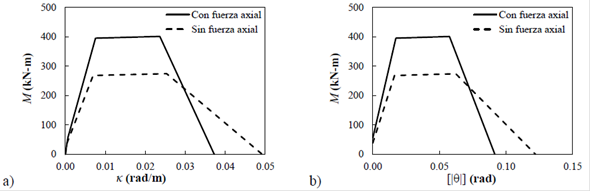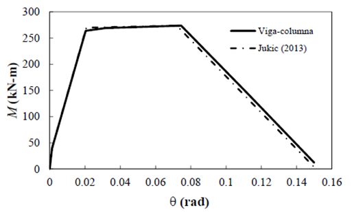 Al aplicar gradualmente la θ en el extremo derecho de la viga, se obtiene la curva de M-θ, que se compara con la curva obtenida por Jukic (2013), como se muestran en la Figura 19, donde se observa que ambas curvas son congruentes hasta una rotación de 0.57 rad; sin embargo, para rotaciones mayores, se presentan diferencias que se atribuyen a los modelos constitutivos distintos utilizados en las respectivas soluciones. El área bajo la curva M-[|θ|] con fuerza normal en la Figura 17 es de 26.723 kN m, la cual corresponde a la energía disipada durante la formación completa de una articulación. Por otra parte, el trabajo inducido al sistema es de 26.723 kN m, que corresponde al área bajo la curva M-θ con fuerza normal en la Figura 19, por lo que la viga disipa adecuadamente la energía mediante la formación de articulaciones.