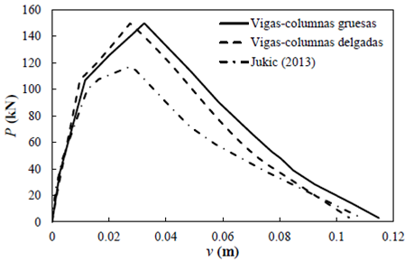 La Figura 26 muestra las curvas P-v calculadas con elementos viga-columna gruesa y delgada, las cuales se comparan con la calculada por Jukic (2013), en las que se observan diferencias entre estas aproximaciones, las cuales se atribuyen a que los resultados reportados por Jukic (2013) dependen del número de elementos. Los resultados obtenidos con ambos elementos, gruesos y delgados, mantienen relación con el comportamiento constitutivo M-κ, las diferencias se atribuyen a la energía por cortante incluida en la formulación de viga-columna gruesa. Además se observa que la curva P-ν no alcanza la magnitud del cortante último, V u , lo cual evidencia que no se forma la discontinuidad por cortante. El área bajo la curva M-[|θ|] en la Figura 24 es de 10.98 kN m, la cual corresponde a la energía disipada durante la formación completa de una articulación. Por otra parte, el trabajo inducido al sistema es de 8.91 kN m, que corresponde al área bajo la curva P-v en la Figura 26. La diferencia entre la energía necesaria para desarrollar la articulación y el trabajo inducido a la viga se atribuye a que no se genera por completo la articulación.