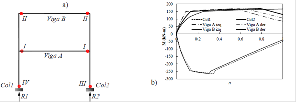 La secuencia de formación de articulaciones se muestra en la Figura 32a, donde simultáneamente ocurren dos articulaciones en los extremos de la viga del primer nivel, posteriormente ocurren otras dos articulaciones en los extremos de la viga del segundo nivel. Después ocurre una articulación en la parte inferior de la columna derecha y, finalmente, ocurre una articulación en la parte inferior de la columna izquierda. En la Figura 32b se muestra la variación del momento contra el incremento de carga normalizado de los puntos donde ocurrió cada una de las articulaciones.