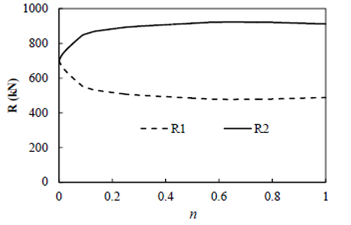 La Figura 33 muestra la variación de las magnitudes de las reacciones verticales R1 y R2 de los apoyos, donde se presentan las fuerzas axiales con mayor magnitud y donde se examinó la ocurrencia del daño por momento flexionante y fuerza normal. Como se esperaba, los elementos mecánicos en las columnas no presentaron fuerzas axiales en tensión durante la acción de la carga F, debido a la acción constante de las fuerzas a compresión aplicadas verticalmente en los nodos 5 y 6. También se observa que la magnitud de fuerza a compresión máxima no excede la fuerza normal última de Nu=5000 kN mostrada en la Figura 33b.