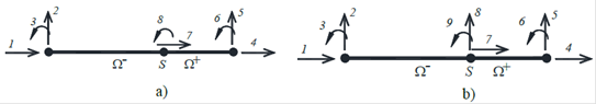 Los elementos viga-columna con discontinuidades interiores se obtienen agrupando los grados de libertad (GDL) del elemento barra con el de las vigas. En el caso del elemento viga-columna delgada tienen ocho GDL, como se muestra en la Figura 6a, en la que los GDL 7 y 8 corresponden respectivamente a los saltos [|u|] y [|ϴ|]. Por otra parte, la viga-columna gruesa tienen nueve GDL, como se muestra en la Figura 6b, en la que los GDL 7, 8 y 9 corresponden respectivamente a los saltos [|u|], [|w|] y [|ϴ|].
