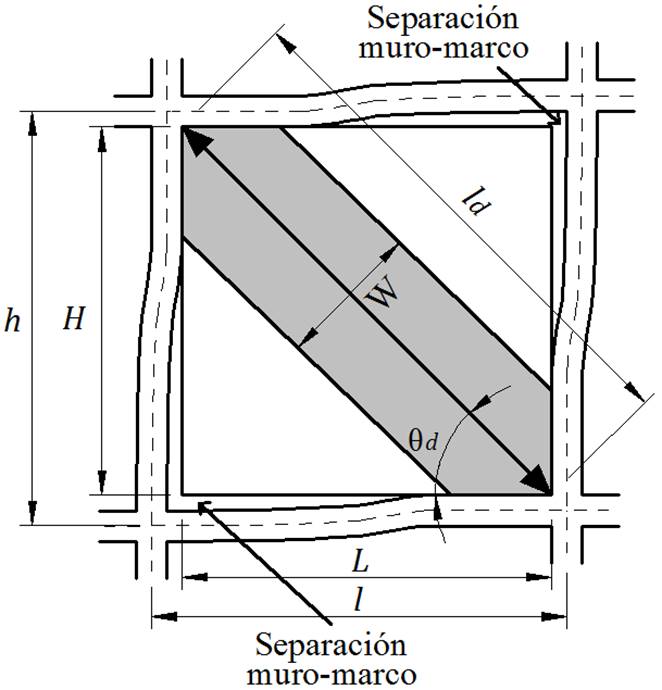 donde Ef y Em son el módulo de elasticidad del material del marco y de la mampostería, respectivamente; Ic y Iv son el momento de inercia de la sección transversal bruta de las columnas y la viga; t, H y L son el espesor, la altura libre y la longitud del muro, respectivamente; y θd es el ángulo que forma la diagonal del muro con la horizontal.