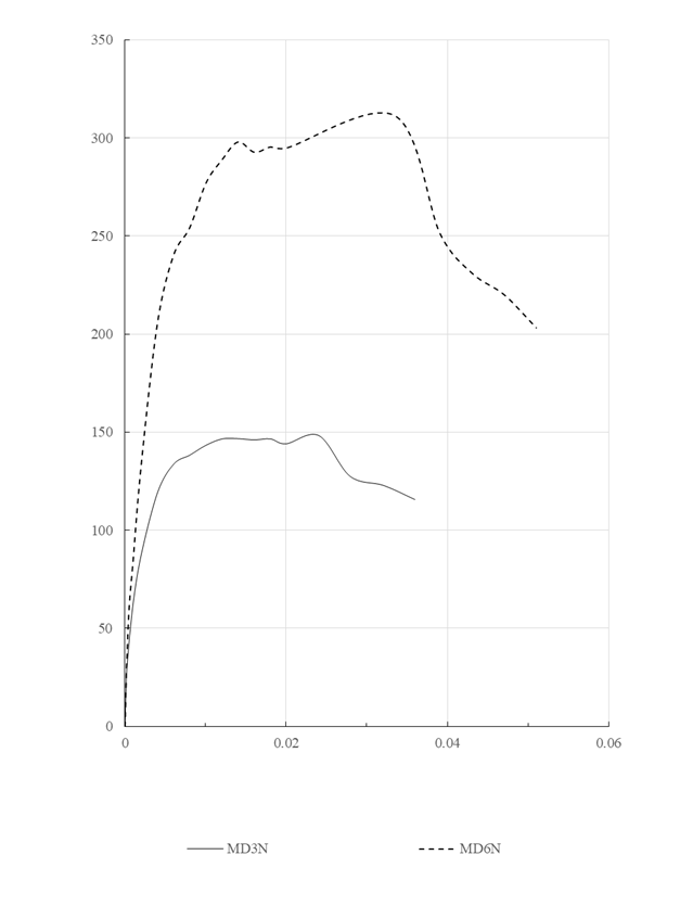 Se observa que las NTCM (2004) no predicen apropiadamente la resistencia lateral del sistema, en ninguno de los casos. La edición 2004 de las normas mexicanas sobreestiman la resistencia. La variación es significativamente mayor para los especímenes con refuerzo horizontal. Las normas sobreestiman un 22.2% y 26.5% la resistencia de los especímenes MD3N y MD6N, respectivamente; mientras que, para el caso de los especímenes con refuerzo, MD3NRH y MD6NRH, la resistencia se sobreestima un 84.3% y 149.7%, respectivamente. Este hecho se explica debido a que, de acuerdo a las NTCM (2004) la contribución del refuerzo se debe incluir, independientemente del modo de falla en el muro. Esto hace que la resistencia del muro con refuerzo sea elevada, y en consecuencia también la del sistema.
