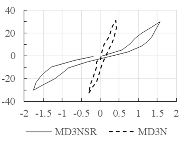 Figura 21 Lazo correspondiente al tercer ciclo de la curva carga lateral (kN) - desplazamiento (mm), de los especímenes MD3NSR y MD3N