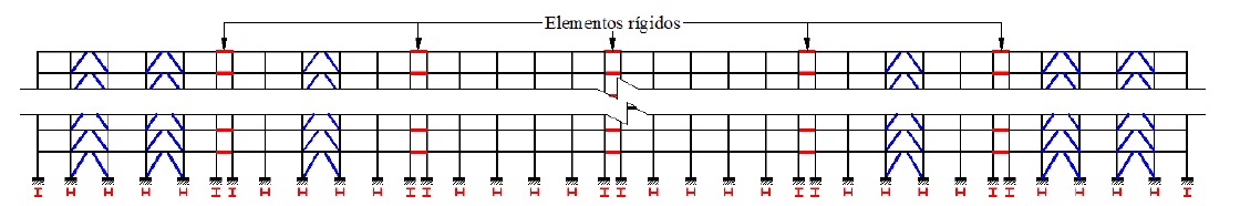 En este artículo se discuten los resultados de la dirección global x, pero se hace notar que la respuesta en ambas direcciones principales fue equivalente debido a su regularidad. Con el propósito de evaluar la contribución total de las fuerzas laterales entre los marcos en una dirección, los marcos del modelo se conectan entre sí mediante elementos infinitamente rígidos y se incluyeron los efectos de un diafragma rígido en cada nivel (Figura 10). Adicionalmente, en los análisis no lineales se consideró un amortiguamiento viscoso igual a ζ= 0.05 conforme a la definición de los espectros de diseño sísmico (e.g. MDOC-08 2008).