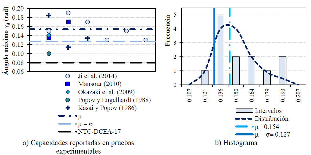 Como se muestra en la Figura 11, la media muestral del estudio, que puede ser consultado en García (2015) resultó ser igual a μ= 0.154 rad. Conservadoramente, aquí se consideró una media muestral menos una desviación estándar que resultó ser igual a μ-σ= 0.127 rad (Figura 11), que es mayor al límite normativo γ= 0.08 rad. Considerar está magnitud del ángulo de rotación máximo en las vigas enlace permitirá relacionar los resultados analíticos con las capacidades de edificios reales con mayor certidumbre. Es posible consultar más información sobre el procedimiento empleado, una amplia discusión de estos resultados de pruebas experimentales y sobre el estudio estadístico en García (2015).