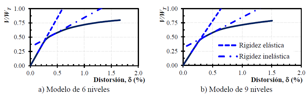 El comportamiento de los modelos se analizó por medio de curvas normalizadas cortante - distorsión de entrepiso y curvas globales. En la Figura 12 se muestran las curvas globales de los modelos estudiados, donde el cortante V está normalizado con el peso total de la estructura W T y la distorsión (definida como el desplazamiento en la azotea dividida entre la altura del edificio) está en porcentaje.