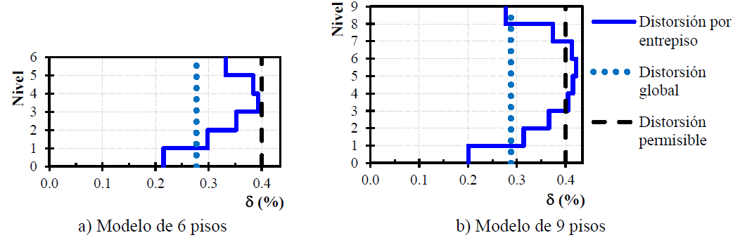 En la Figura 14 se muestran las distorsiones por entrepiso, distorsiones globales reportadas en los análisis y el límite propuesto en las NTC-DS-17 para la revisión del estado límite de servicio. En ambos casos, la distorsión máxima de entrepiso es cercana al límite permisible propuesto (δyp= 0.4%), por esta razón, el límite normativo parece adecuado, pese a que las distorsiones de los entrepisos intermedios del modelo de 9 niveles exceden el límite en un 5%