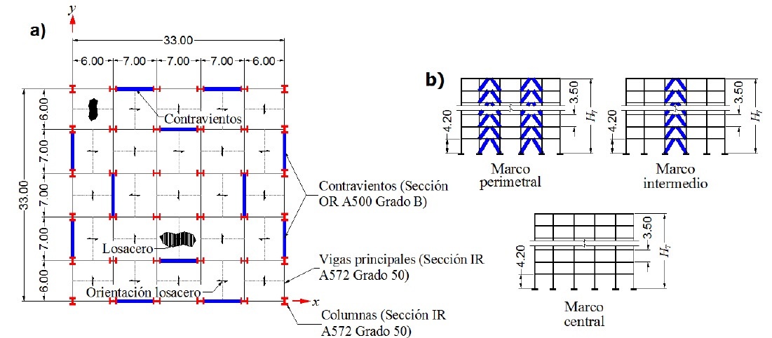 El sistema de piso se consideró como un sistema compuesto formado con una lámina acanalada y un firme de concreto armado (conocida localmente como losacero), con una orientación que se varió por tablero para favorecer que la respuesta lateral en ambas direcciones fuera equivalente, por lo que igualmente se varió la dirección de las columnas de los marcos como se muestra en la Figura 2a.