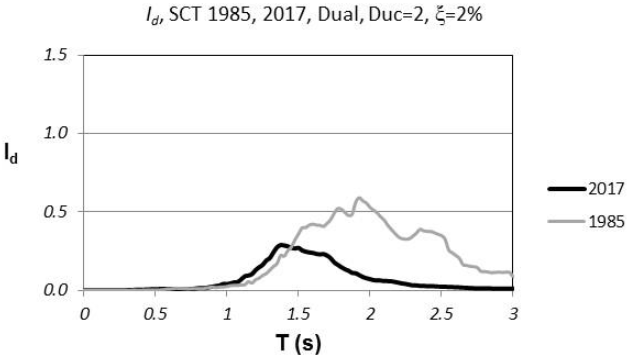 En este trabajo se obtienen valores del índice I d para los registros de aceleraciones en la estación SCT de 1985 y 2017 anteriormente comentados. Para la fracción de amortiguamiento crítico, ξ, se emplea el valor 2%, con base en las recomendaciones de Martinelli y Filippou (2009). Se considera una altura de entrepiso, h, típica de 3 m. Para esta evaluación se consideran dos tipos de sistemas estructurales sismorresistentes, el sistema a base de marcos y el sistema dual (combinación de marcos y muros estructurales .de concreto reforzado). Para el primer tipo de sistema se considera λ=7s-1, con el cual en algunos casos de estructuras muy flexibles (por ejemplo de losas planas sin vigas) podría estar sobrestimado, lo que llevaría a sobrestimar la rigidez lateral de estos edificios flexible y a subestimar los valores de I d . Para los sistemas del tipo dual, los cuales se empezaron a emplear en México de manera más frecuente después de 1985, se considera de manera conservadora λ=10s-1. Estos valores de λ son congruentes con valores típicos en México cuando se emplea la Ec. (1) para el cómputo aproximado del periodo fundamental de un edificio de concreto reforzado. La Fig. 8 muestra en una gráfica los valores de I d calculados con la Ec. (1) para edificios a base de marcos para el caso μ=2, para el registro en la dirección EO obtenida en la estación SCT en 1985, estos resultados se muestran con línea gris. Se debe notar que la componente EO para esta estación fue más intensa que la de la componente NS. También esta figura muestra resultados del cómputo de I d para el registro obtenido en el terremoto de 2017 en la estación SCT para la dirección EO, los que se muestran con línea negra. En la Fig. 8 se observa que los valores calculados para I d para el caso del terremoto de 1985 en estructuras existentes en esa época son congruentes con los daños y colapsos observados en ese evento, los cuales se concentraron en la zona de periodos de alrededor de 2s. Sin embargo, de acuerdo con los resultados de la Fig 8, los edificios a base de marcos analizados con el registro de la SCT en 2017, ver línea negra en la figura, no habrían tenido daños graves o colapsos en el terremoto de 2017, lo que no es congruente con lo observado en edificios en este terremoto, por lo que estos resultados se vuelven a evaluar más adelante empleando otras hipótesis.