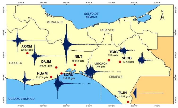 De acuerdo con lo reportado en el boletín de la Sociedad Mexicana de Ingeniería Sísmica (SMIS, 2017); así como en redes nacionales (SSN, 2017) y locales en Tuxtla Gutiérrez, Chiapas (estación de la Red Interuniversitaria de Instrumentación Sísmica (RIIS) y del sistema de alertamiento sísmico municipal), se obtuvieron aceleraciones pico en la zona cercana al epicentro, tales como de 488.7 cm/s2 en Santiago Niltepec, Oaxaca (Figura 1). Estas aceleraciones son un indicador de la magnitud de los daños en la región Istmo de Tehuantepec, Oaxaca, región que concentró la mayor parte de la energía del evento y de las subsecuentes réplicas (SSN, 2017). Los datos para el estado de Chiapas se muestran en la Tabla 1 y se constriñen a las dos principales ciudades del estado. En la Figura 2 se representa la ubicación de las estaciones en Tuxtla Gutiérrez, Chiapas que registraron el sismo del 7 de septiembre de 2017.