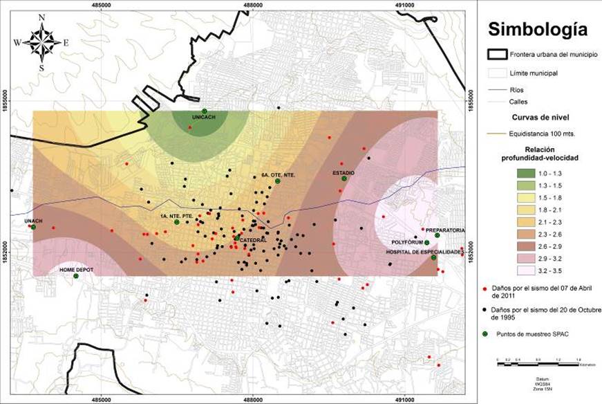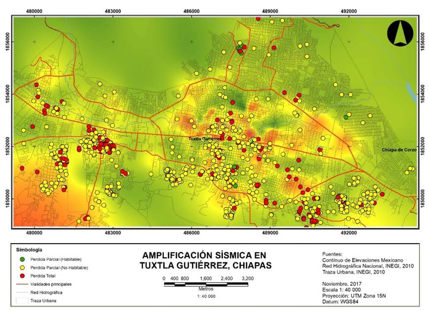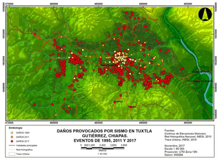 Asimismo, y tras comparar los daños de los sismos más recientes que se tienen caracterizados en la ciudad de Tuxtla Gutiérrez (7 de abril de 2011 y del 21 de octubre de 1995; así como la probable ubicación de los daños durante el paleosismo del 23 de septiembre de 1902 (Figueroa, 1973)), con el empleo de Sistemas de Información Geográfica se observó que la ubicación de los daños coincide espacialmente con la de los producidos por el sismo reciente (7 de septiembre de 2017). Al analizar las consecuencias del sismo se observó que, no obstante que los sistemas estructurales asociados a las construcciones que fueron dañadas están presentes a lo largo de toda la mancha urbana, los daños se concentraron en zonas específicas de la ciudad, lo cual es un indicador importante del efecto de sitio.