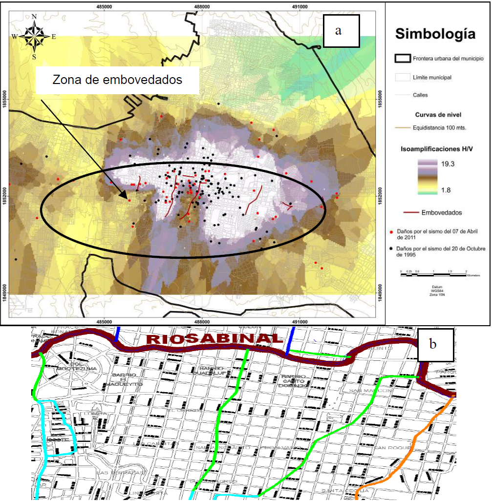 Dentro de los resultados de este trabajo se identificó el efecto de sitio como una causal determinante de daños históricos en la ciudad, lo cual se demostró tras analizar los daños de los sismos del 23 de septiembre de 1902, 21 de octubre de 1995, 7 de abril de 2011 y 7 de septiembre de 2017. Los resultados mostraron que en la ciudad se presentó un efecto de sitio con amplificaciones de la aceleración sísmica de hasta tres veces en los sitios donde se ubican estaciones acelerométricas fijas. No obstante, la predominancia de los efectos de sitio en los daños por sismo, en este trabajo se analizó la influencia de otras variables, tales como una serie de embovedados que conducen los remanentes de escurrimientos superficiales de antiguos cauces que irrigaban el río Sabinal y que se encuentran desplantados bajo la zona de estudio; así como la calidad constructiva y antigüedad de las edificaciones que fueron dañadas.