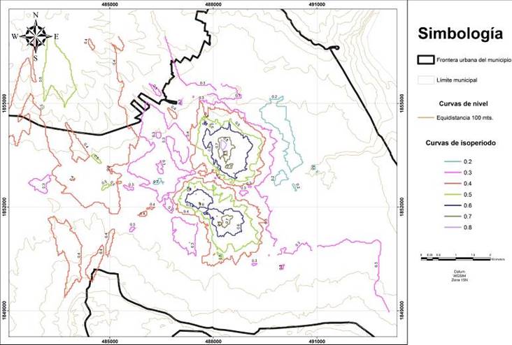 Para la adquisición de estos registros se utilizaron dos grabadoras Altus modelo Makalu con sensores modelo Episensor con rango de sensibilidad de -¼ de g hasta 4 g y sensores de velocidad Lenartz de un segundo. Los registros se tomaron con 200 muestras cada segundo a lo largo de 30 minutos de muestreo por cada punto. En la distribución de estos registros se consideró la densidad de población, distancia entre 200 y 400 m entre los distintos puntos, buscando tener una interpolación adecuada, siendo el centro de la ciudad donde se densificaba la toma de muestras debido a los daños históricos por sismos (García y Suárez, 1996). En la Figura 14 se muestran las curvas de isoperiodos para la ciudad. La amplificación relativa varía desde 2 hasta 25 veces, en una distribución dispersa en toda la ciudad.