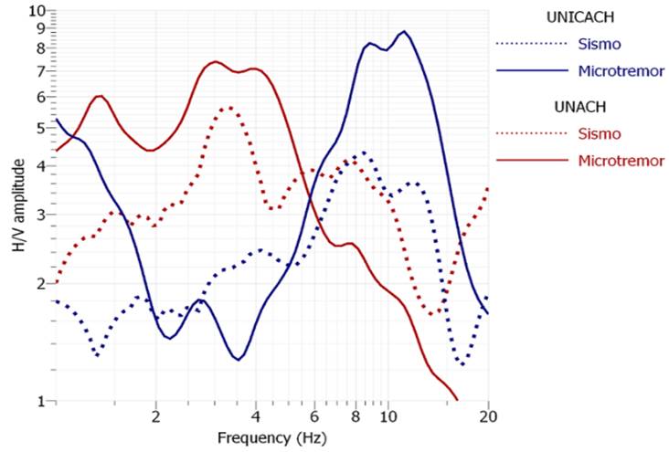 En la Figura 18 se muestra la gráfica del cociente espectral H/V para ruido ambiental y para el sismo del 7 de abril de 2011, se observa que la señal de la UNICACH presenta un pico predominante en la frecuencia de 8.5 Hz con una amplitud relativa de 4. Para la relación H/V de la UNACH el pico predominante se observa en la frecuencia de 3.5 Hz con una amplificación relativa de 7. Los cocientes espectrales H/V del sismo, con respecto a los cocientes espectrales de los microtremores, no varían considerablemente en la forma, pero las amplitudes son mayores.