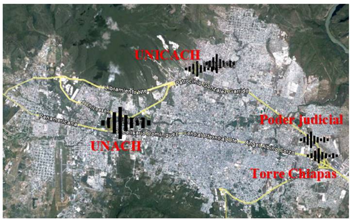 El interés por conocer la estructura de velocidades de los puntos seleccionados para el estudio se debió a que en cinco de los puntos se observaron daños estructurales asociados a efecto de sitio, de acuerdo con estudios anteriores (Narcía et al., 2006; Piña, 2012). Los tres arreglos restantes (estacionamiento del estadio, Facultad de Ingeniería de la UNICACH y cercanías de la Torre Chiapas) consistieron en polígonos de hasta 400 m por lado, constituidos por triángulos equiláteros convencionales y correlaciones lineales. Dos sitios adicionales corresponden a la ubicación de las estaciones acelerométricas fijas en la ciudad (UNICACH, sede ladera norte y UNACH, poniente de la ciudad).