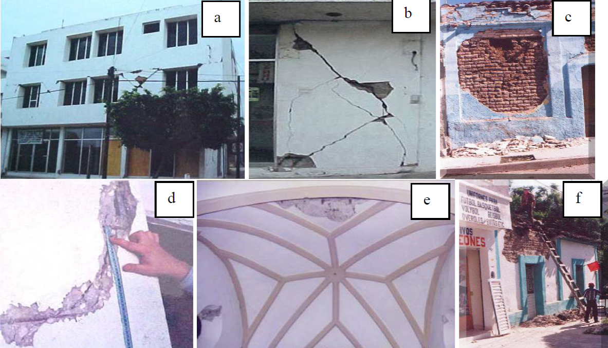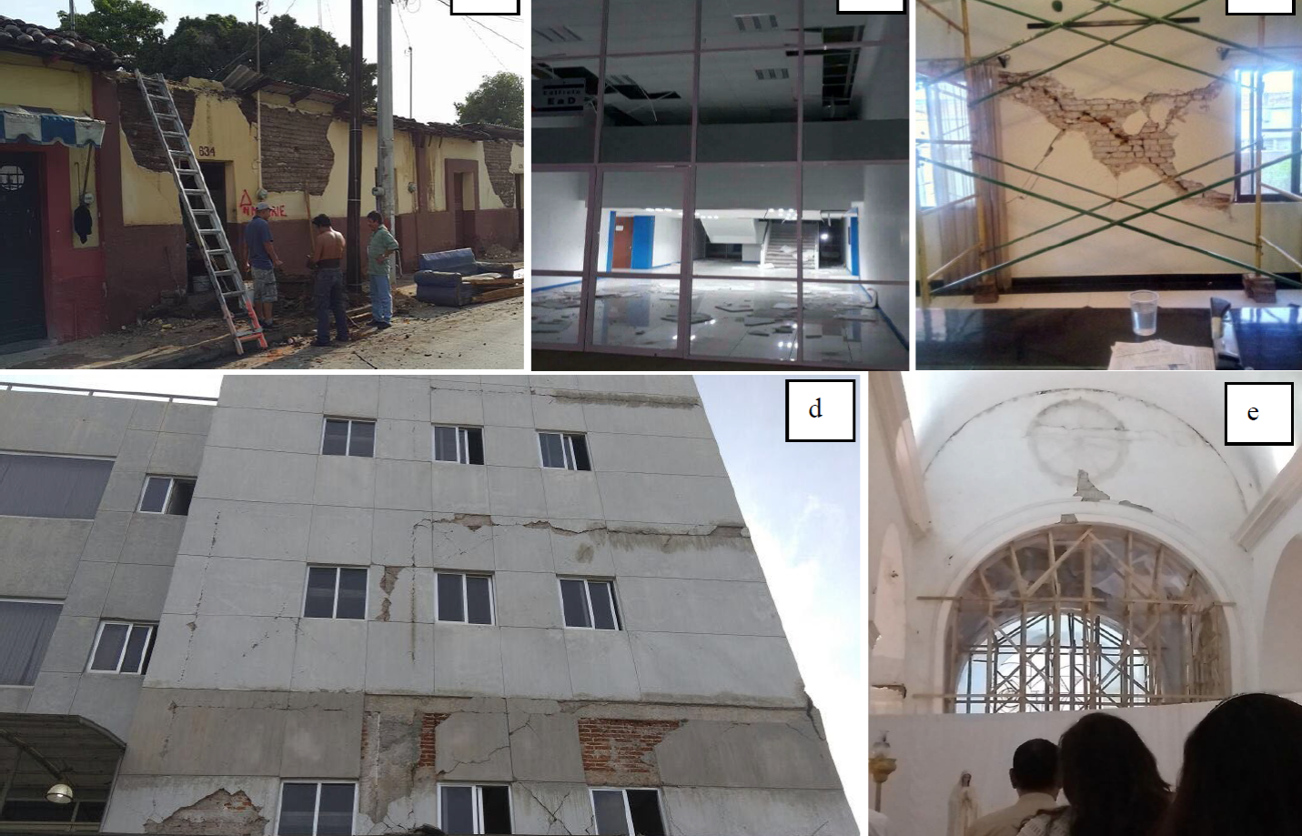 El sismo del 7 de septiembre de 2017 produjo daños importantes en la ciudad. Los daños observados se atribuyen al efecto de sitio en la zona, a los materiales de construcción empleados, a la falta de mantenimiento, etc. Asimismo, la falta de recursos económicos y/o asesoría técnica es determinante, ya que la mayoría de los proyectos dañados son ejecutados mediante autoconstrucción, no solo de viviendas precarias, sino hasta residencias ejecutadas sin criterios ingenieriles y con materiales de baja calidad (Sánchez-Trujillo et al., 2019). En la Figura 6 se observan algunos de los daños característicos observados durante el trabajo de campo.