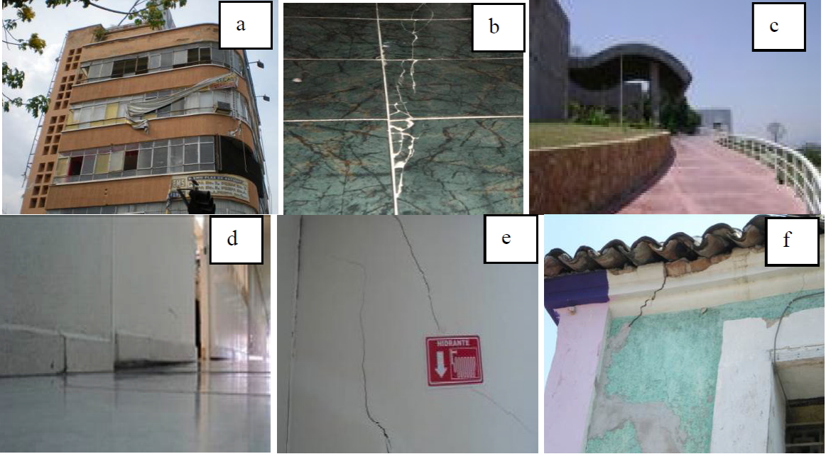 Figura 5 Fotografías de los daños causados por el sismo de Las Choapas de 2011 en Tuxtla Gutiérrez (González-Herrera et al., 2012). (a) Edificio Corzo; (b) Rectoría de la UNICACH; (c) COCYTECH; (d, e) Hospital de especialidades “Vida mejor”; (f) Vivienda en el centro de la ciudad