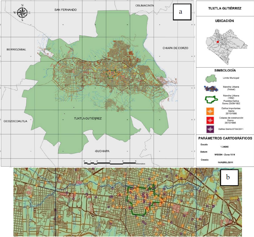 Figura 7 Daños históricos por sismo en Tuxtla Gutiérrez (González-Herrera et al., 2012). (a) Mancha urbana; (b) Centro de la ciudad. El polígono verde representa la mancha urbana de 1892 y posibles daños del sismo de 1902; puntos naranjas, daños del sismo de 1995 y puntos morados, daños del sismo del 7 de abril de 2011