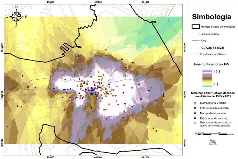 En la Figura 17 se muestran los daños del sismo del 7 de septiembre de 2017 colocados sobre las amplificaciones sísmicas de la microzonificación de González-Herrera et al. (2012), las cuales son coincidentes con los colores cálidos, por lo que se asume que el daño que sufre una edificación por las ondas de un sismo depende, en gran medida, del tipo de terreno sobre el cual está construida y de los materiales empleados para su construcción (Garduño et al., 2009); sin embargo, en zonas donde la vulnerabilidad de las construcciones es homogénea, el efecto de sitio es determinante (Moreno et al., 2019).