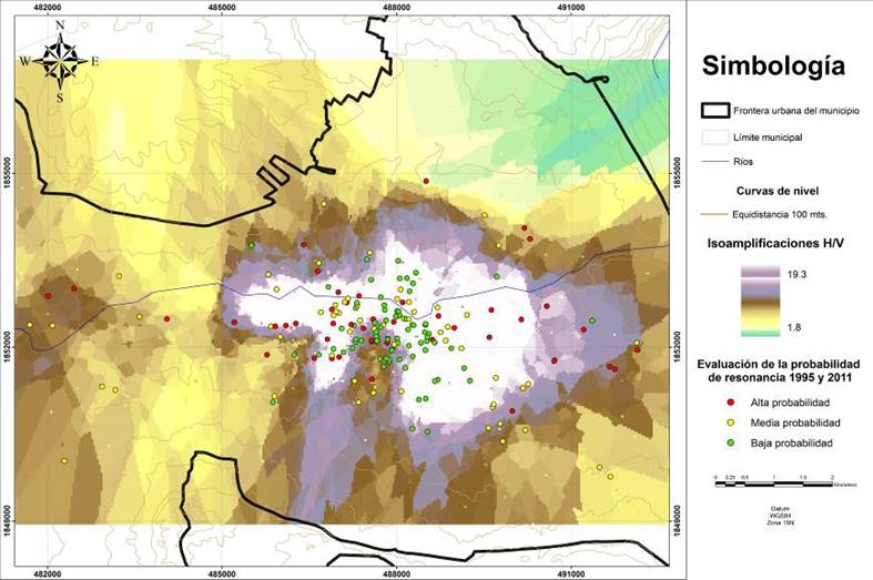En la Figura 9 se muestra un análisis donde los puntos rojos corresponden a casos de daños donde el periodo del suelo y de la construcción son prácticamente los mismos, los puntos amarillos donde hay una diferencia desde 0.1 s hasta 0.15 s entre ambos periodos, y en punto verde donde hay diferencias superiores a 0.16 s entre ambos periodos. De acuerdo con la distribución espacial de las estructuras de mampostería en el centro de la ciudad, difícilmente fueron afectadas por el fenómeno de resonancia, no obstante, en la ladera sur existe una mayor probabilidad de que se haya presentado este fenómeno (puntos amarillos y rojos). Siguiendo con este análisis de distribución, las estructuras de concreto que pudieron ser afectadas por resonancia se concentran en el centro de la ciudad y aledañas al cauce del río Sabinal y se representan con punto rojo. Cabe mencionar que el área del mapa del valle de Tuxtla Gutiérrez y ladera sur, identificada con color blanco, es la zona donde se concentra la mayor parte de amplificación y de daños históricos por sismo.