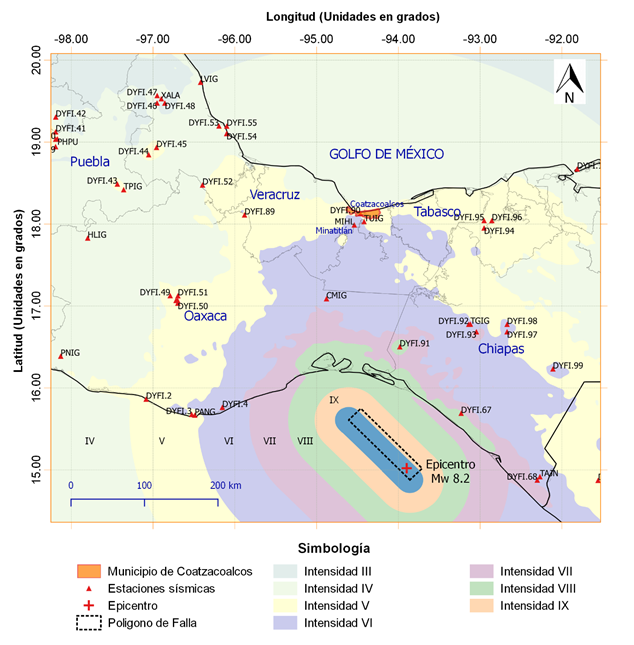 Figura 1 Ubicación de Coatzacoalcos, Veracruz, México, en el mapa de intensidades sísmicas de Mercalli Modificado, generado por el USGS del sismo del 7 de septiembre de 2017