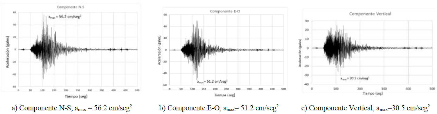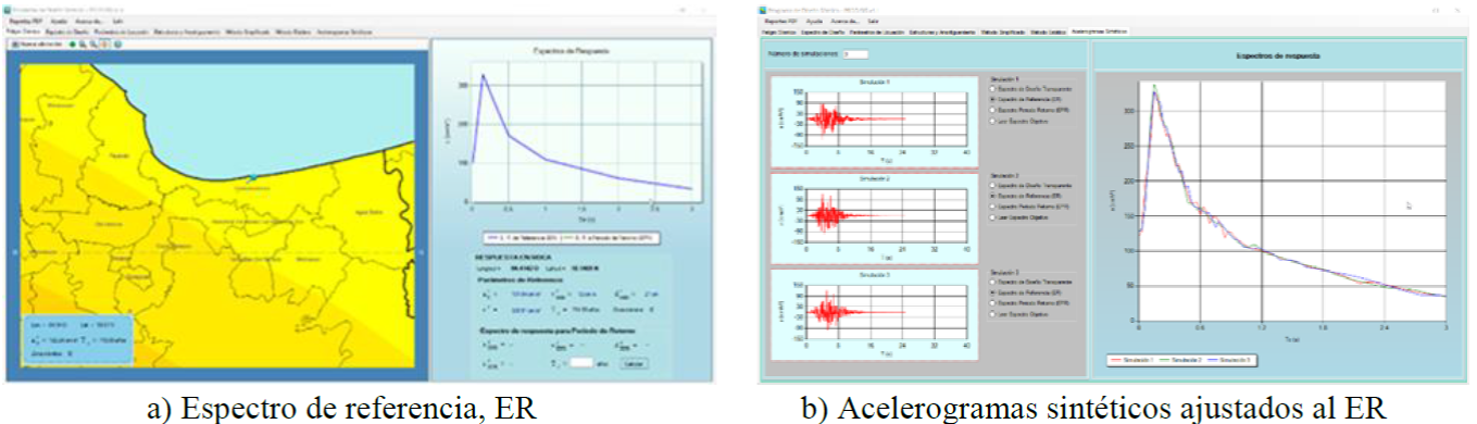 Para tener una referencia del nivel de aceleraciones que se presentaron en la zona de estudio durante el sismo del 7 de septiembre de 2017, se hizo una comparación entre las aceleraciones en superficie que se alcanzaron durante este sismo, y las aceleraciones de diseño que se pueden presentar cuando se emplean las máximas aceleraciones probables, considerando el peligro sísmico de acuerdo con el PRODISIS, Tabla 4. Para ello se obtuvieron del PRODISIS tres acelerogramas sintéticos cuyos espectros de respuesta se ajustan al espectro de peligro uniforme (espectro de referencia, ER) para la zona de estudio, Figura 15. Como los acelerogramas sintéticos de la Figura 15b, representan al movimiento del suelo basal, es decir en roca, fue necesario realizar la “seudo” convolución (siguiendo el procedimiento descrito anteriormente) entre el espectro de amplitudes de Fourier de los acelerogramas sintéticos y el producto espectral HVNR, que se obtuvo de ruido sísmico, en los puntos de estudio.