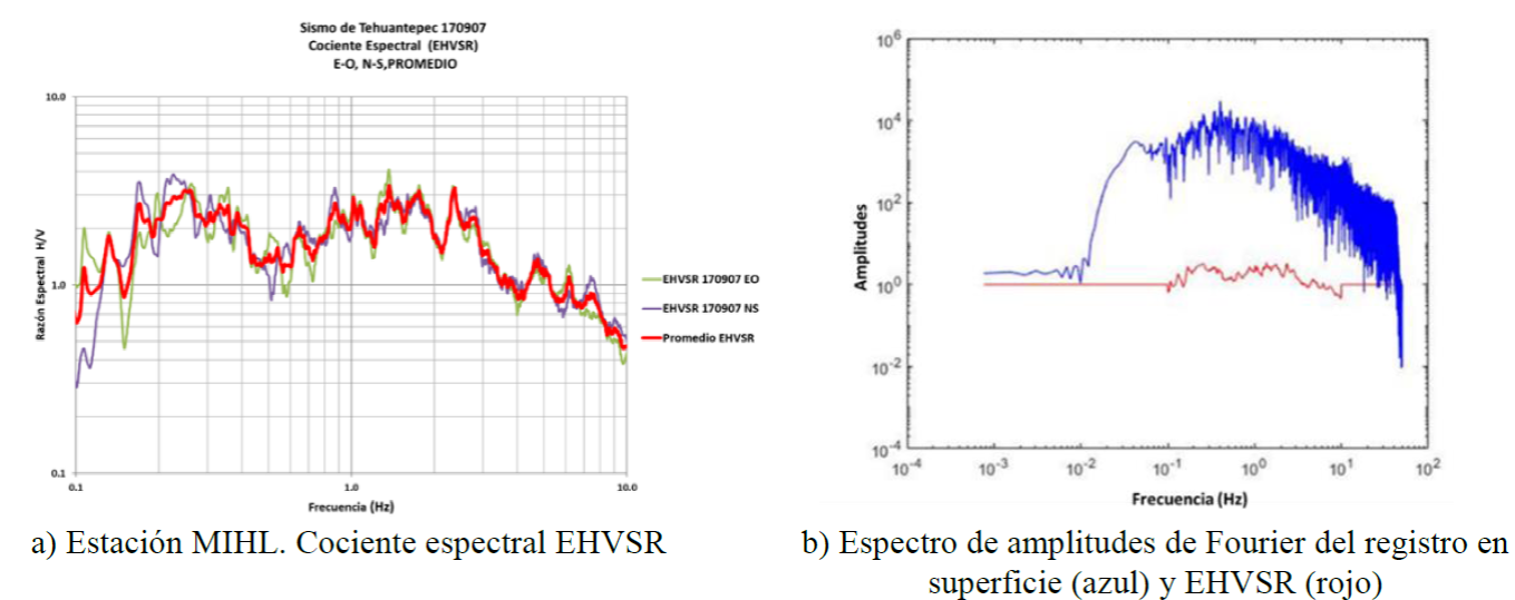 Es frecuente evaluar el efecto de sitio (Lermo et al., 1993; Chávez et al., 2014), utilizando el cociente espectral de la componente horizontal con la vertical en el dominio de las frecuencias, para registros de sismos obtenidos en una estación sobre sedimentos, EHVSR, (Earthquake Horizontal to Vertical Spectral Ratio), cuando no se cuenta con una estación de referencia cercana, o que haya registrado los mismos eventos. El cociente espectral para el registro del sismo del 7 de septiembre de 2017 en la estación MIHL se determinó para cada dirección (N-S y E-W), y después se promediaron. Para estos cálculos se utilizó el programa DEGTRA (Ordaz et al., 2013) y los resultados se muestran en la Figura 11a.