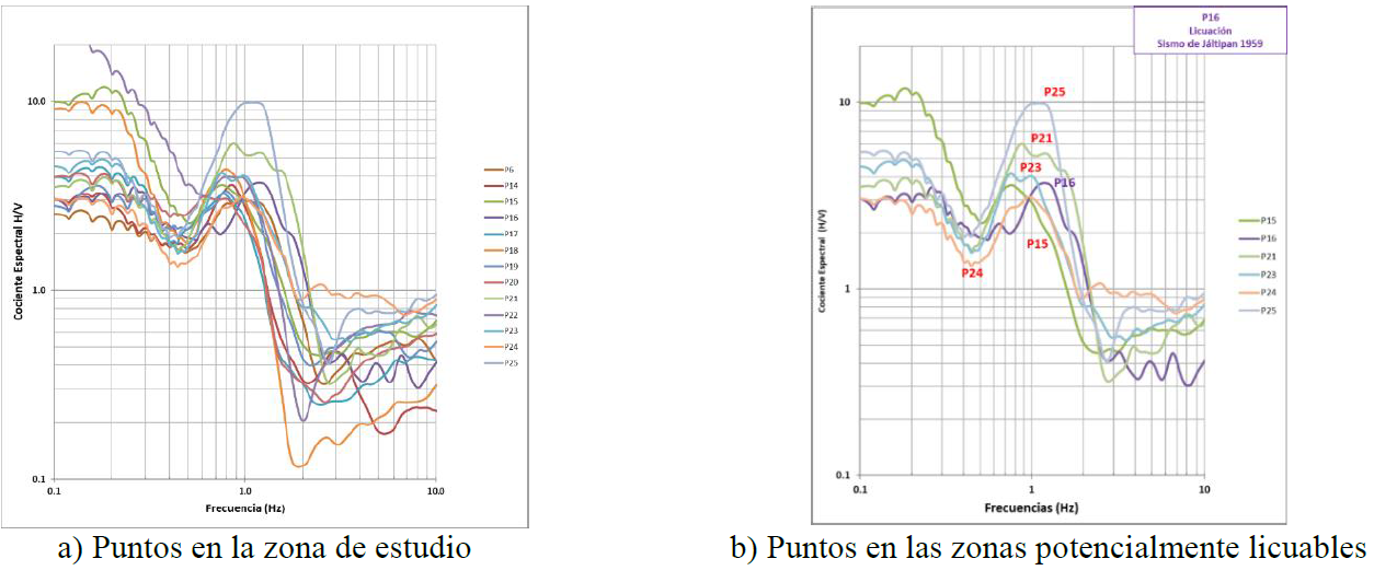 En la zona en estudio se identificaron tres zonas potencialmente licuables y en la Tabla 3 se relacionan las zonas con los puntos donde se tomaron registros de vibración ambiental. En la Figura 13b, se indican los cocientes espectrales de los puntos incluidos en las zonas y el punto P16 donde hubo licuación en el sismo de Jáltipan de 1959.