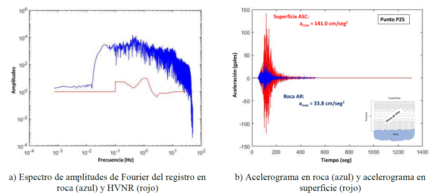 En la Figura 14a se muestra el espectro de amplitudes del AR, línea azul, y los cocientes espectrales H/V del punto 25, línea roja, por ser el sitio en donde se presentan las mayores amplificaciones. Los acelerogramas del sitio se muestran en la Figura 14b, en donde en azul aparece el AR y en rojo el acelerograma en superficie ASC, apreciándose de esta manera la amplificación que sufre la señal al propagarse hasta llegar a la superficie.