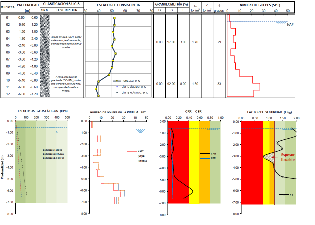 En donde CRR representa la capacidad de resistencia del suelo a licuarse y CSR representa la fuerza sísmica que actúa en el suelo. En teoría, cuando el valor del factor de seguridad (FSlic) es menor que la unidad, se presenta el fenómeno a la profundidad analizada. En la práctica existe incertidumbre acerca del valor del FSlic que debe utilizarse, ya que han existido casos en los cuales el suelo se ha licuado a pesar de tener un FSlic>1 (Youd e Idriss, 2001). Por lo anterior, el Building Seismic Safety Council (BSSC, 2003) recomienda que el FSlic debe de estar sujeto a la importancia de la estructura y potencial de deformación del suelo. Martin y Lew (1999) sugirieron valores del FSlic asociados al número de golpes de la prueba SPT, en donde para valores de Nspt<15, recomienda utilizar un FSlic de 1.2. Esta última consideración fue adoptada para nuestro análisis.