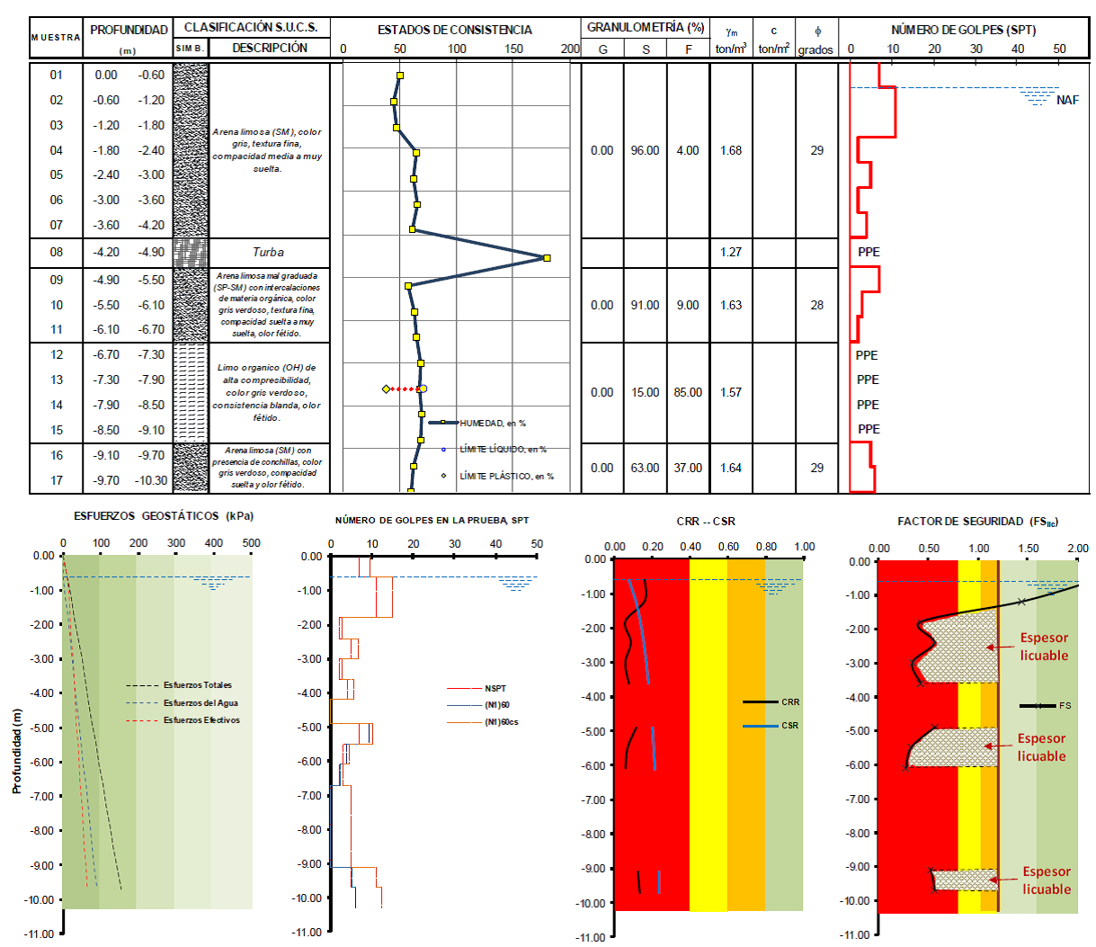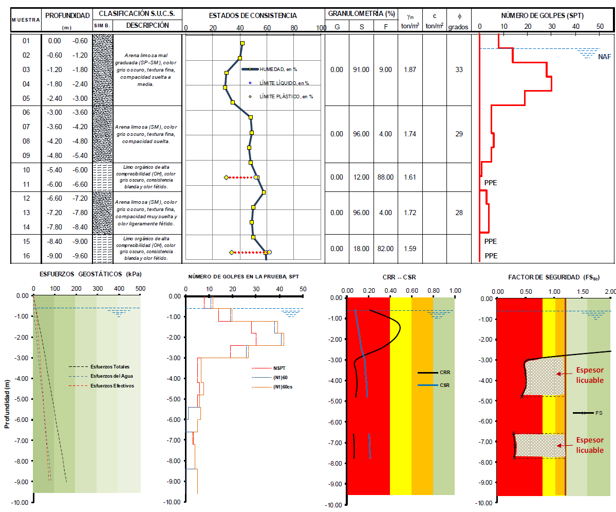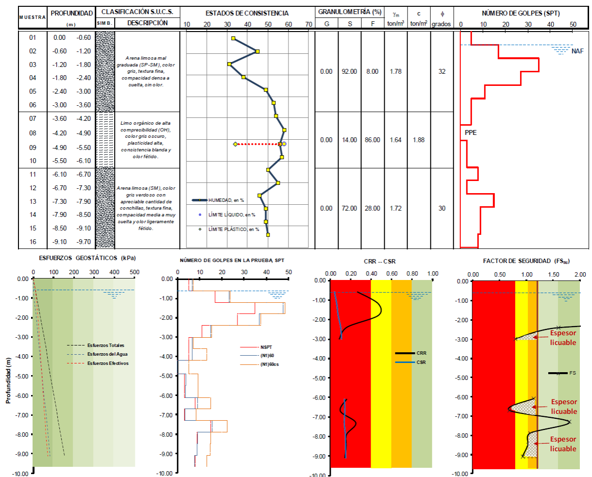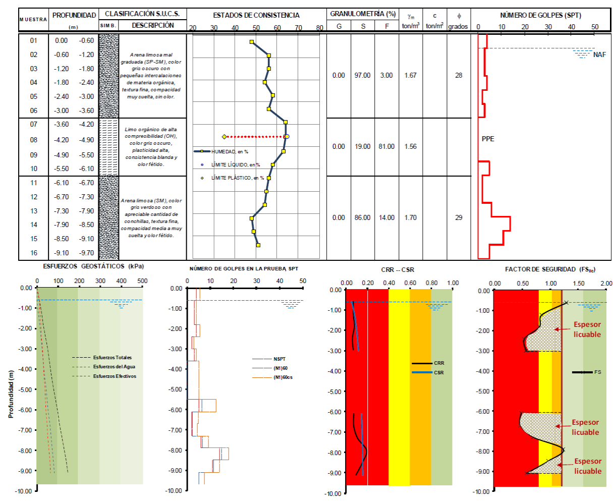Figura 16 Perfil estratigráfico y resultados del análisis a la vulnerabilidad a la licuación del sondeo SPT-01