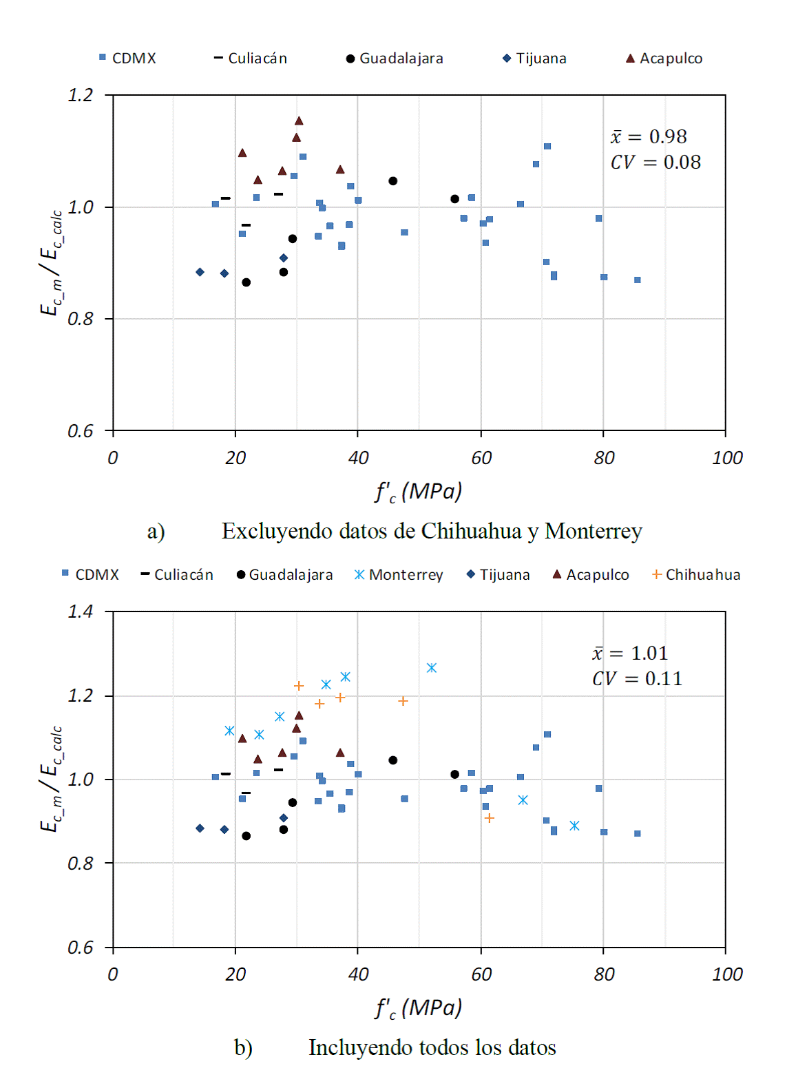 La fig. 11 muestra valores de la relación E c_m / E c_calc , empleando para E c_calc la ec. 13 para concretos de peso normal. Esta figura se divide en dos figuras, la fig. 11(a) excluye a los casos de Chihuahua y Monterrey, y la fig. 11(b) corresponde a todos los casos estudiados. Para el primer caso, la media entre los valores medidos y calculados fue 0.98, y el valor de CV fue igual a 0.10. Los valores mínimo y máximo para esta relación fueron 0.74 y 1.20, respectivamente. Cuando se consideran todos los casos de la base de datos, la media entre los valores medidos y calculados fue 1.02, y el valor de CV fue igual a 0.13. Los valores mínimo y máximo para esta relación fueron 0.74 y 1.32, respectivamente.
