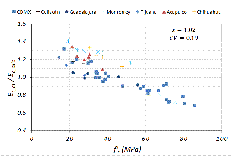 La fig. 5 muestra resultados para la relación E c_m / E c_calc , donde E c_calc se obtuvo empleando el ACI-318-14 (2014), ec. 5, y el valor de w c de cada espécimen. Se puede apreciar que para concretos mayores de 40 MPa, los valores de Ec calculados sobrestiman de manera considerable los valores medidos. La media de E c_m / E c_calc fue igual a 1.02 y con un valor del coeficiente de variación, CV, igual a 0.19. Los valores mínimo y máximo para esta relación fueron iguales a 0.68 y 1.41, respectivamente.