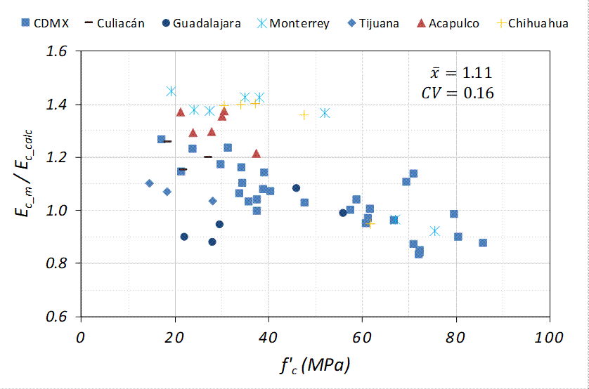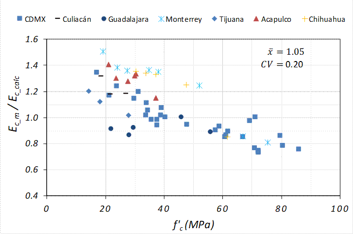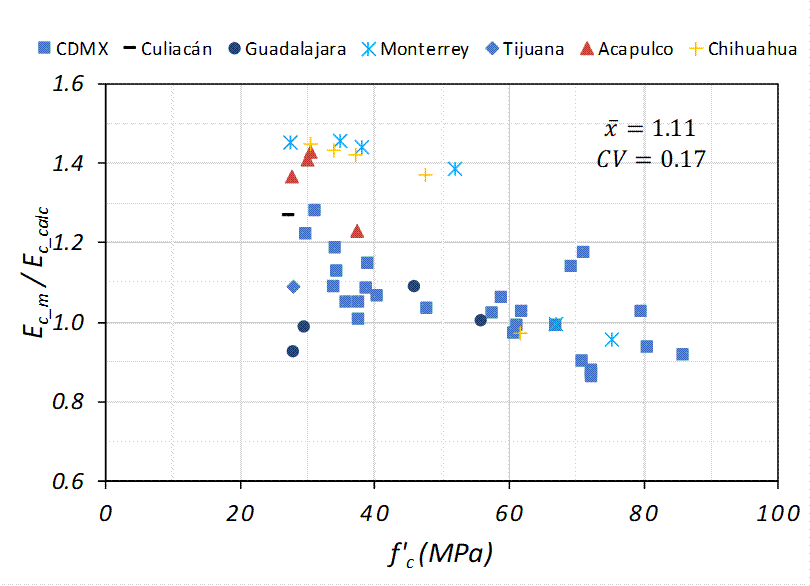 La fig. 8 muestra resultados para la relación E c_m / E c_calc , donde E c_calc es el valor calculado de E c con las ecs. 7 y 8 de las Normas Técnicas Complementarias (NTC, 2017). En los resultados de la fig. 8 se consideraron solo concretos con valores de resistencias especificadas en compresión iguales o mayores que 25 MPa, estos concretos son los que se emplean en la fabricación de concretos clase 1 en la Ciudad de México (NTC, 2017). Estos resultados muestran que utilizar la NTC (2017), lleva a una variabilidad considerable y a la tendencia de sobreestimar para concretos de alta resistencia los valores medidos de E c . La media de esta relación es igual a 1.11 y con un valor del CV igual a 0.17. Los valores mínimos y máximo para esta relación son iguales a 0.86 y 1.45, respectivamente.