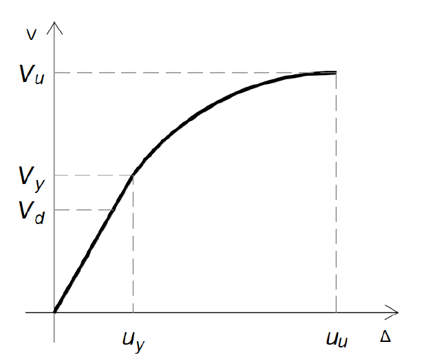 Siguiendo la idea de los mecanismos de daño deseados, en este trabajo se utiliza el concepto de superestructura débil-cimentación fuerte, considerando la necesidad que el sistema suelo cimentación permanezca cuasi-elástico a medida que la superestructura desarrolla toda su capacidad. Consideremos una estructura representada por la curva de capacidad (cortante basal V contra desplazamiento () mostrada en la figura 1. Siguiendo las metodologías actuales de diseño, la fuerza cortante de diseño reducida por comportamiento inelástico y sobrerresistencia está representada por el cortante V d . Debido a las decisiones de diseño y las resistencias nominales de los materiales, la fuerza cortante para la cuál se presentará la primera fluencia en la estructura será mayor (V y ). Adicionalmente, la redundancia de los sistemas estructurales y la redistribución de elementos mecánicos produce que la estructura incursione progresivamente en el intervalo de comportamiento inelástico, en la cuál la fuerza cortante deberá seguirse incrementando para producir mayores desplazamientos. El valor máximo de la fuerza cortante está asociado con el desplazamiento inelástico correspondiente a la demanda de ductilidad esperada en la estructura (V u ). Considerando que la cimentación suele diseñarse utilizando las fuerzas actuantes de diseño (V d en este caso) es probable que la resistencia de la cimentación no sea suficiente para asegurar que la estructura desarrolle toda su capacidad.