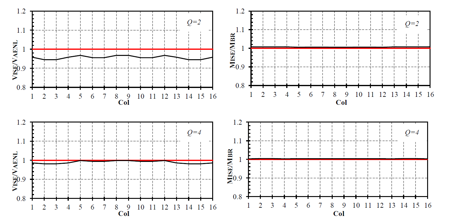 Una de las variables que pueden modificar los elementos mecánicos máximos que la superestructura puede desarrollaren su incursión en el comportamiento inelástico son los efectos de interacción suelo estructura. Como se mostrará en los modelos de diez niveles, los efectos de interacción suelo estructura modifican no sólo el comportamiento del sistema, sino que adicionalmente modifican los parámetros fundamentales de diseño y por lo tanto las demandas a las que están sometidos. Para estudiar exclusivamente la influencia de los efectos ISE en el comportamiento de los modelos, se realizó una comparación de los elementos mecánicos obtenidos mediante AENL de los modelos de seis niveles con base rígida y con base flexible. Los modelos de seis niveles con base flexible no se estudian a profundidad dado que no se realizó un análisis y diseño completo de los mismos. Estos modelos son exactamente iguales a los modelos 6BRQ2 y 6BEQ4 con la única diferencia de que en el AENL, en dichos modelos se ha incluido la influencia de la flexibilidad de la base mediante el uso de las funciones de impedancia, de forma similar que para el caso de los modelos 10BFQ2 y 10BFQ4. En la figura 7 se muestran los cocientes de los elementos mecánicos en la base de las columnas de los modelos con base flexible (VISE y MISE) y de los modelos con base rígida (VBR y MBR) para los diseños con Q=2 y Q=4.