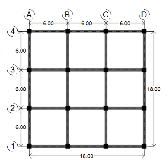Los edificios analizados están estructurados con marcos de concreto reforzado. Se consideran edificios de seis y diez niveles. Todos los edificios tienen la misma planta cuadrada de tres crujías en ambos sentidos mostrada en la figura 2. En todos los casos los sistemas de piso se modelaron como diafragma rígido en todos los niveles. En altura, todos los modelos tienen un entrepiso de 3.5 m en planta baja, y 3 m en los niveles subsecuentes. No se consideran irregularidades ni discontinuidades del edificio.